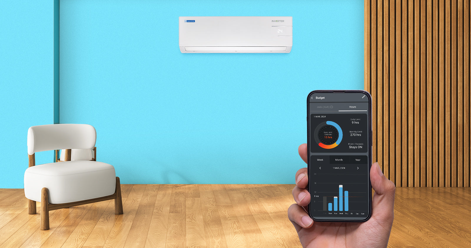 Blue Star's Wi-Fi enabled Smart App allows you to set the desired temperature and control your AC.